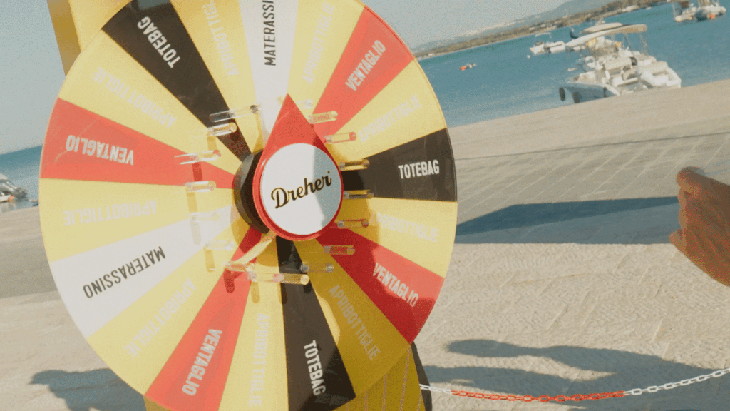 l’allestimento dello stand, la ruota della fortuna, la photo opportunity, l’ape-car personalizzata e i gadget pensati per essere utili e memorabili.